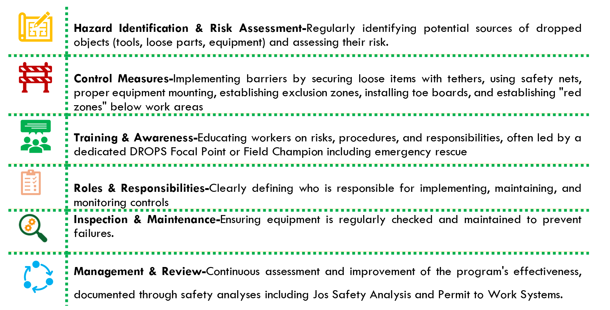The solution lies in development and implementation of a comprehensive Dropped Objects Prevention Program (DOPP). A Dropped Objects Program is a safety initiative designed to prevent injuries and damage caused by falling objects at worksites.